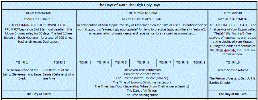 The Feast of Trumpets and the Day of Atonement are the beginning and end of the ten High Holy Days, also called “The Days of Awe”. The Feast of Trumpets is celebrated at the beginning of the High Holy days for two days. The Day of Atonement is the last day. In between these two bookends are Seven Days of Affliction”. If a Jew did not participate in the seven days of affliction they were to be cut off (out) of the community. These Seven Days of Affliction represent the Seven Year Tribulation. See below: