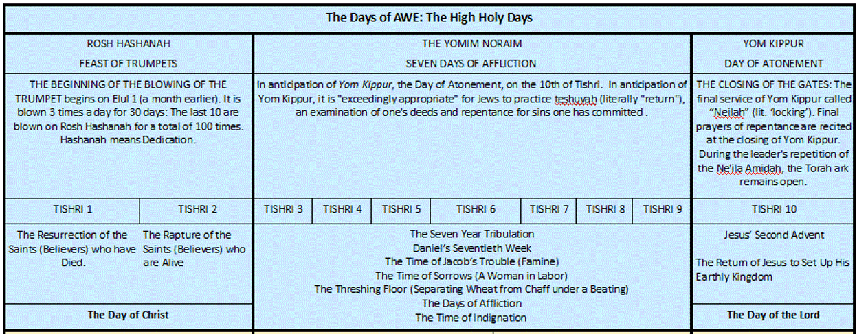 - Whether symbolic or literal, The High Holy Days describe the seven year tribulation comparing them to the seven days of affliction in Jewish Feasts called the “Yomim Noraim” nestled between the Feast of Trumpets and Yom Kippur called the Day of Atonement.