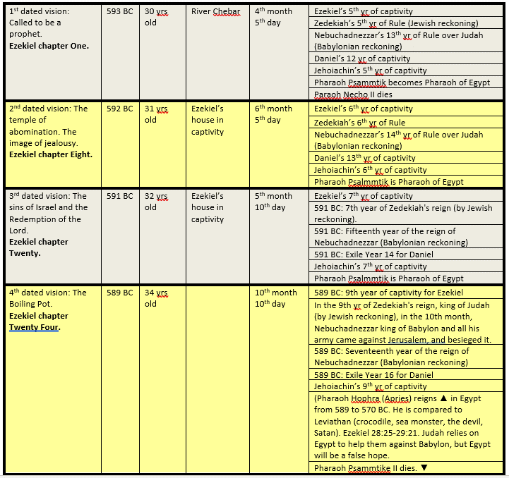 God will use Nebuchadnezzar, the son of the king of Babylon and his armies as His tool of Judgment. In only one day Daniel and others are taken, Nebuchadnezzar’s father dies while Nebuchadnezzar is North of Jerusalem causing him to cut across the desert to claim his throne, and this is just the beginning. At the second pass, the King of Judah is taken with Ezekiel and many others including “Kish” (the progenitor of Queen Esther who will someday rule Persia). Then finally, all the inhabitants are taken captive and Jerusalem is destroyed. The pot is thrown to the ground.