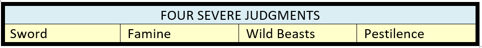 | Sword = War, Combat, An actual sword or the Word of God | Famine = A lack of the Bread from heaven. Physical starvation and/or spiritual starvation. Famine = Fruitlessness, Starvation, Drought, Misery, Dearth. A lack of God’s life giving resources, God’s manna (bread) from heaven. | Wild Beasts = Untamed, Lawless, Unpredictable, Heartless | Pestilence = plague, pandemic |