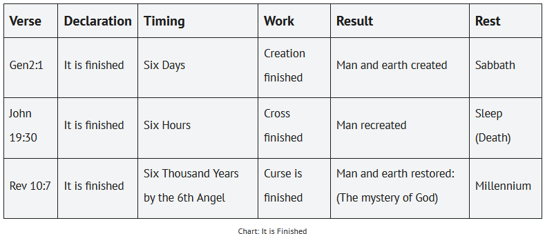 | Crucifixion | John 19:30 | It is finished | Six Hours | Cross | Man reinstated | Sleep (Death) |