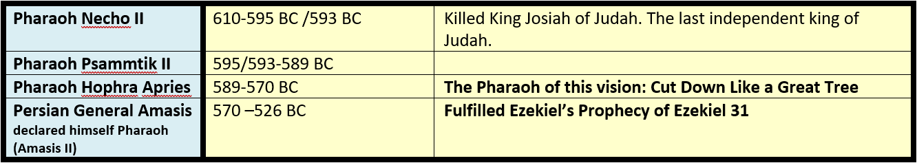 Pharaoh Hophra Apries at this time had his own problems. His Persian General Amasis made a covenant with Nebuchadnezzar to cut down Hophra in exchange for Nebuchadnezzar’s support. Egypt became a vassal nation to Babylon.