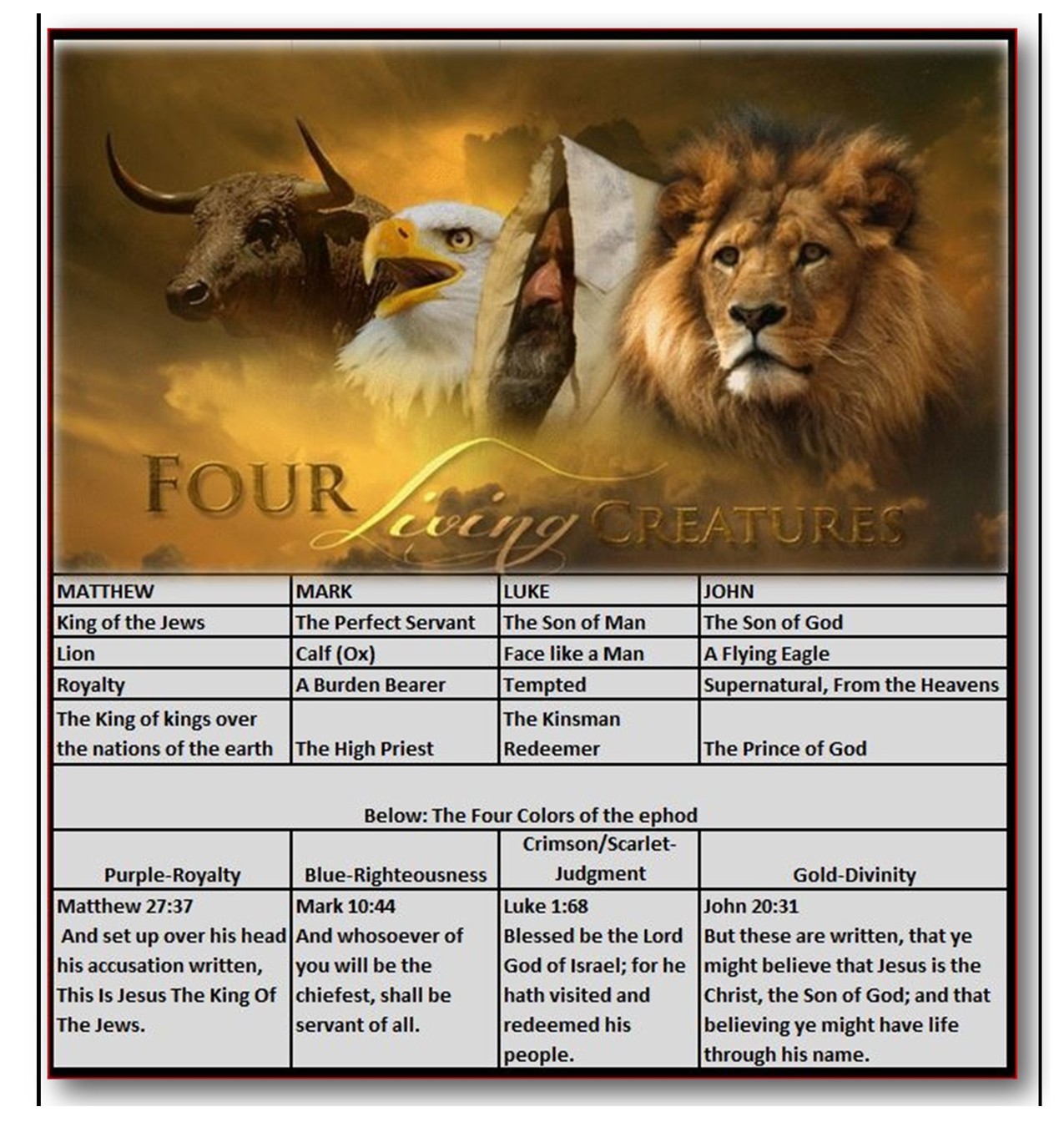 Ezekiel 10:14 Each one had four faces: the first face was the face of a cherub (ox/calf), the second face the face of a man, the third the face of a lion, and the fourth the face of an eagle.