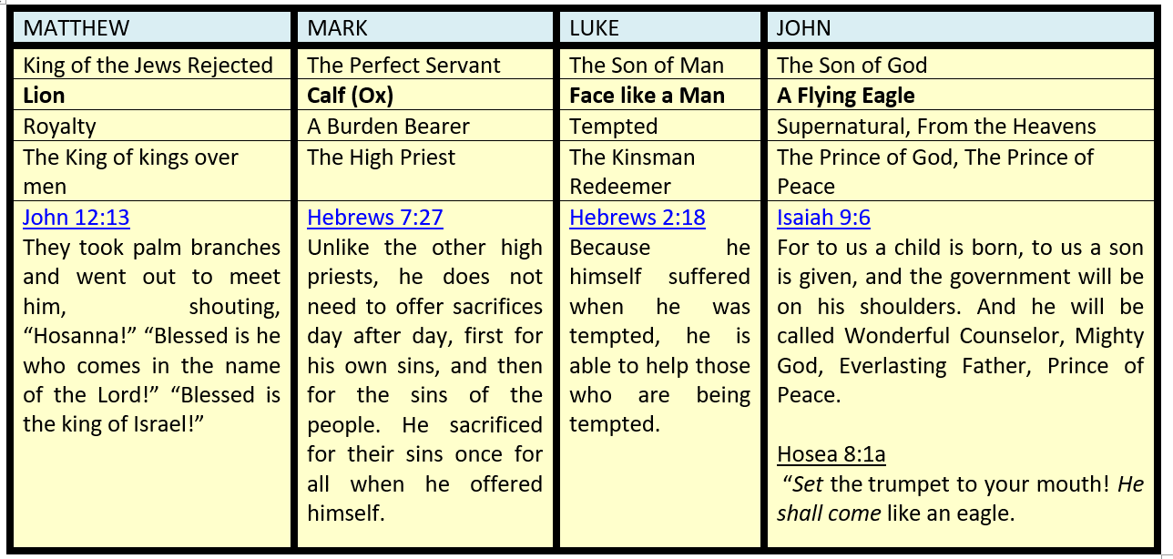 Ezekiel 10:14 Each one had four faces: the first face was the face of a cherub (ox/calf), the second face the face of a man, the third the face of a lion, and the fourth the face of an eagle.