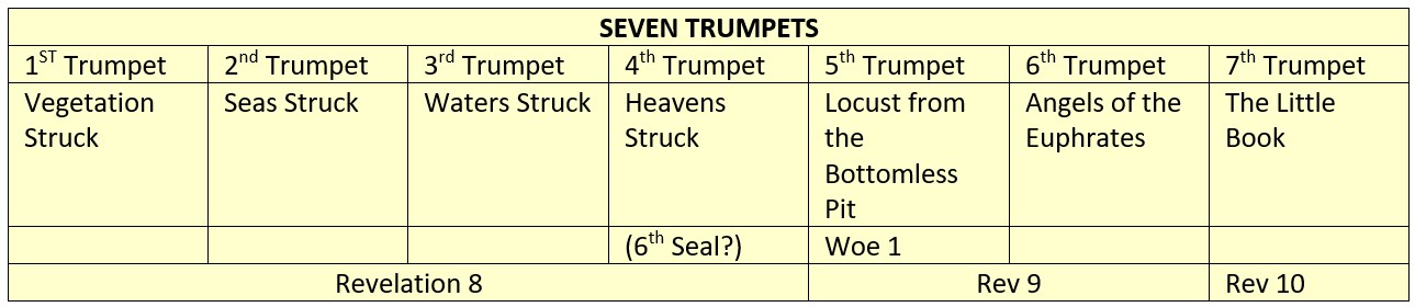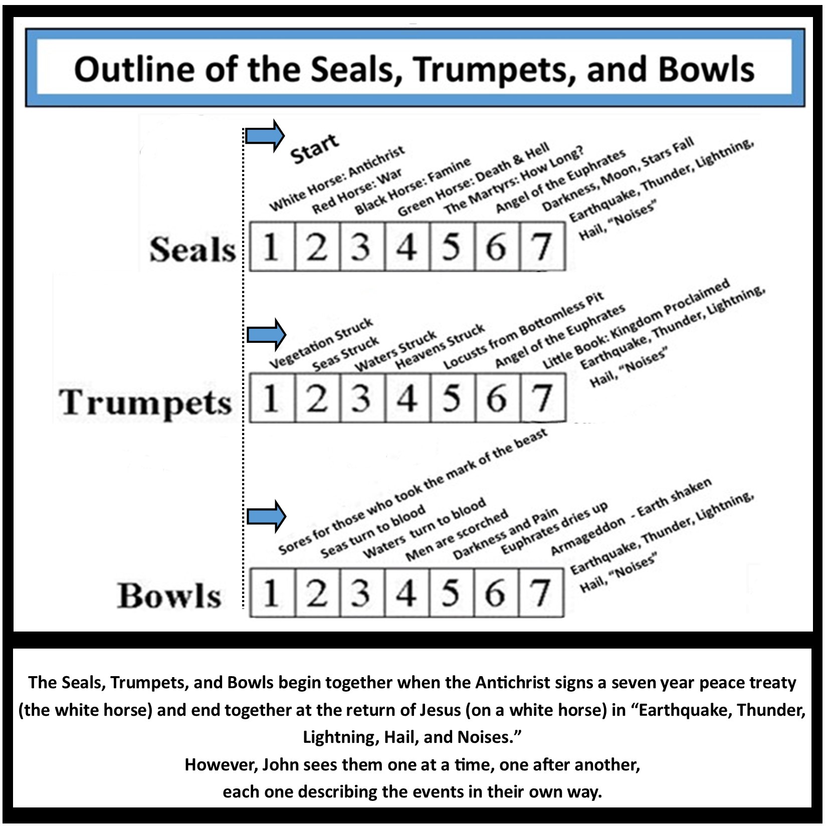 In each instance the story of the seven year tribulation begins again from a different vantage point. The first vantage point is the seals, the second vantage point is the trumpets and the third vantage point is the bowls.