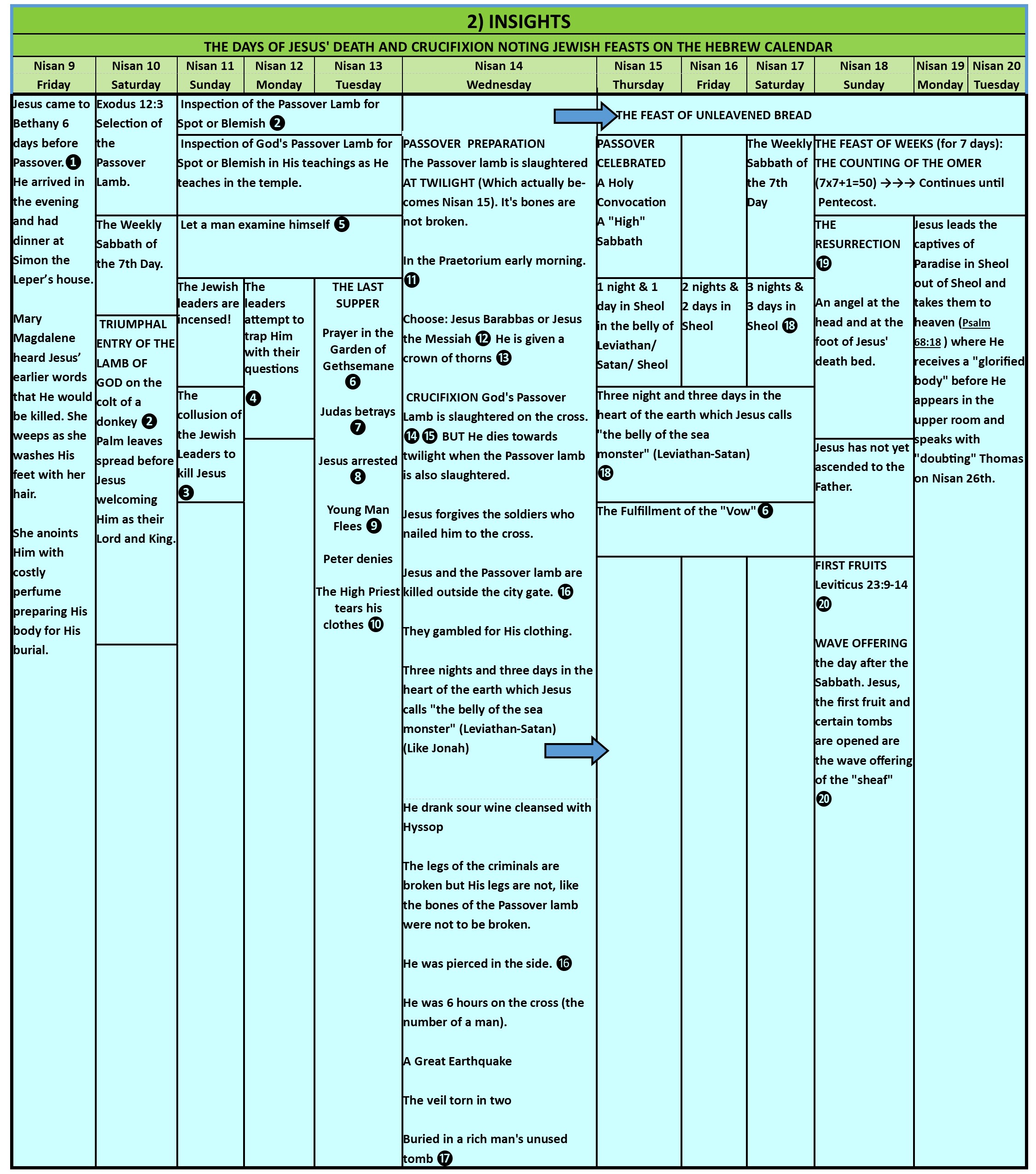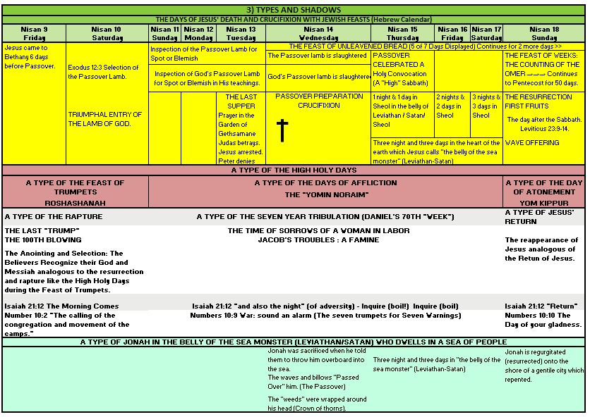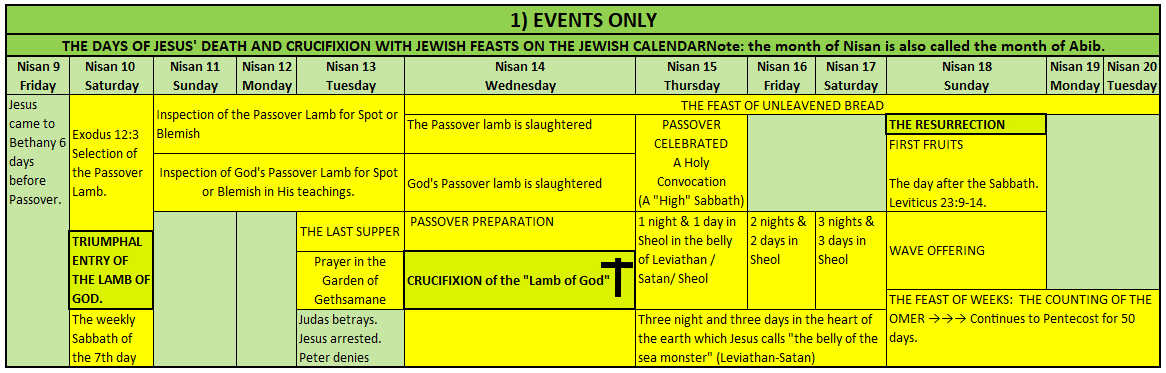 NOTE: THE ROMAN CALENDAR DAYS OF THE WEEK ARE DAYS AND EVENINGS. THE JEWISH CALENDAR DAYS BEGIN IN THE EVENING: THEY ARE EVENINGS AND DAY. TO KEEP DAYS CLEARER: THE ROMAN DAYS OF THE WEEK ARE LINED UP WITH THE JEWISH DATES. THIS CALENDAR CAN BE REFERENCED FOR THE DIFFERENCE.