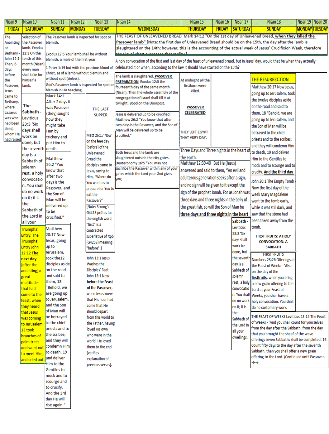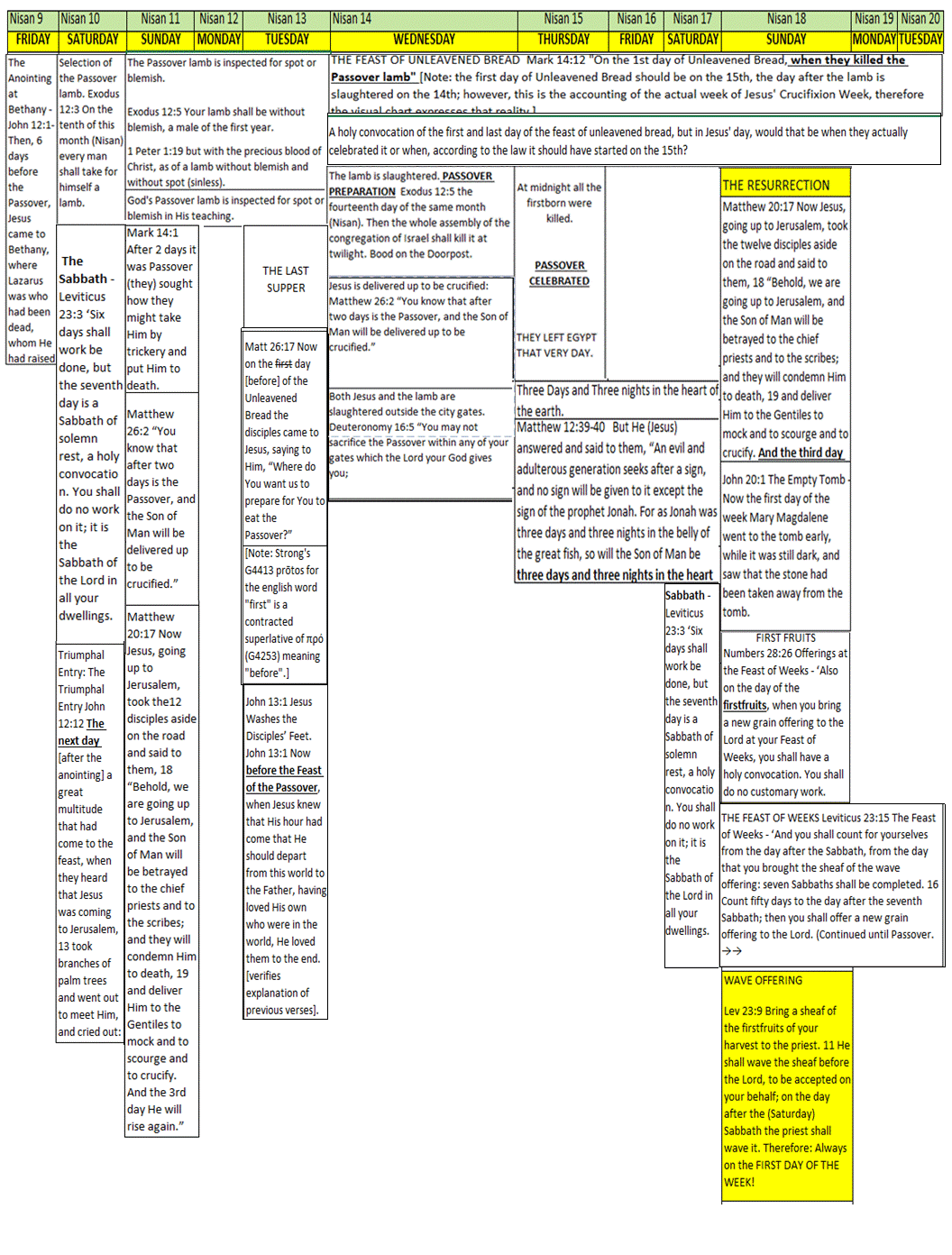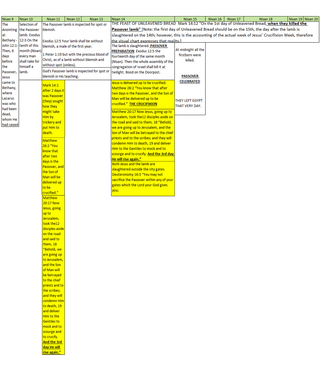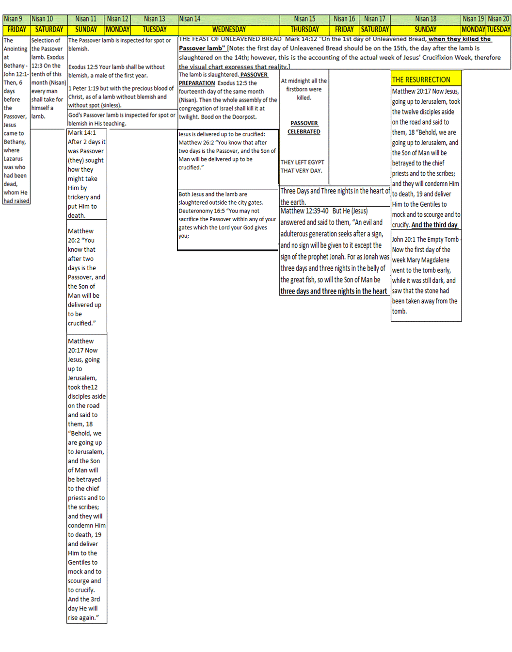 For now forget the days of the week. Begin by building the events according to the Jewish Month of Nisan (also called Abib) and the days of the month beginning with Nisan 9 and ending with Nisan 20.