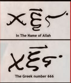 - Walid Shoebat, http://www.shoebat.com/ a former PLO terrorist now Christian evangelist, admits when he saw the three Greek symbols translated in the Bible as 666 (χξϚ), he immediately read it in Arabic (right to left) as “Bismillah” which means “in the name of Ϛ (stigma) Allah ξ (zai) with the two crossed swords of Islam χ (chi)”