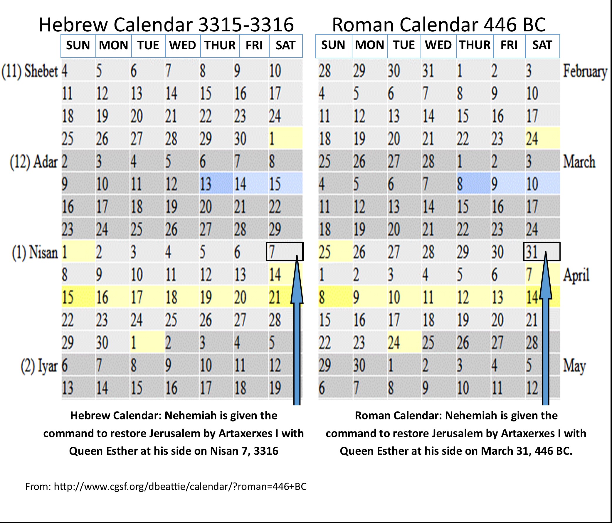 - On Saturday, March 31st 446 BC Nehemiah stood before the king with Queen Esther at his side when the command went out to restore Jerusalem. Click here to see: Timeline 311 BC -500 BC. then Scroll down to 446 BC on the Timeline.