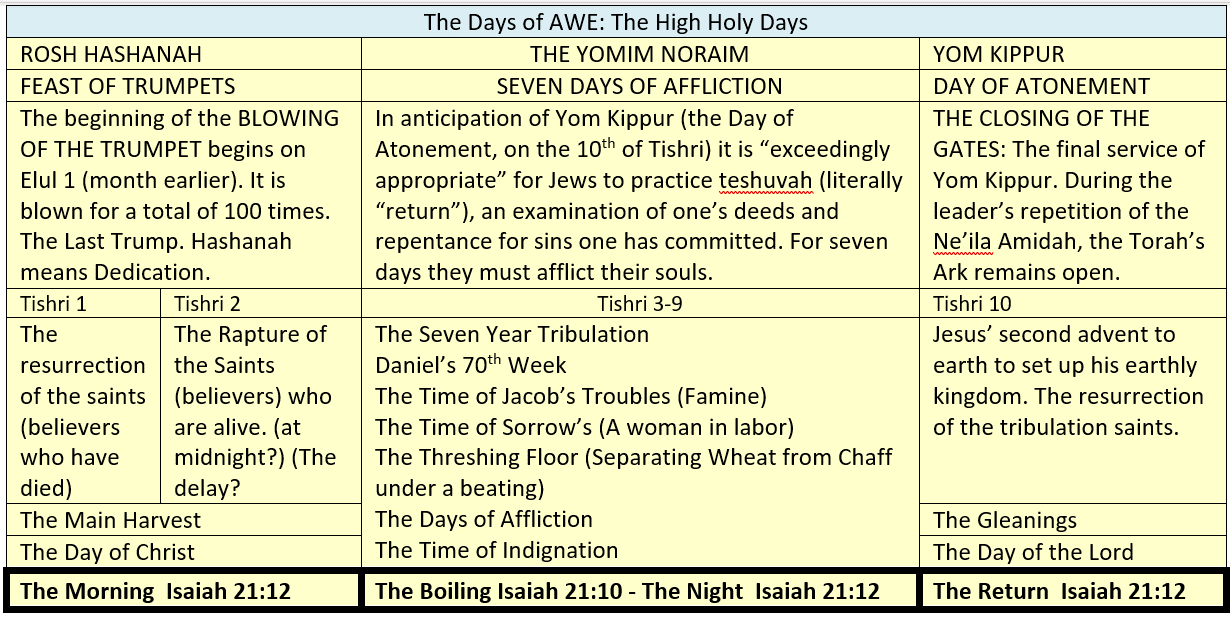 This pattern suggests a “Pre-Trib” rapture, followed by the seven year tribulation, followed by Jesus’ immediate return. A total of ten days. These days are called the “High Holy Days”, or the “Days of Awe”.