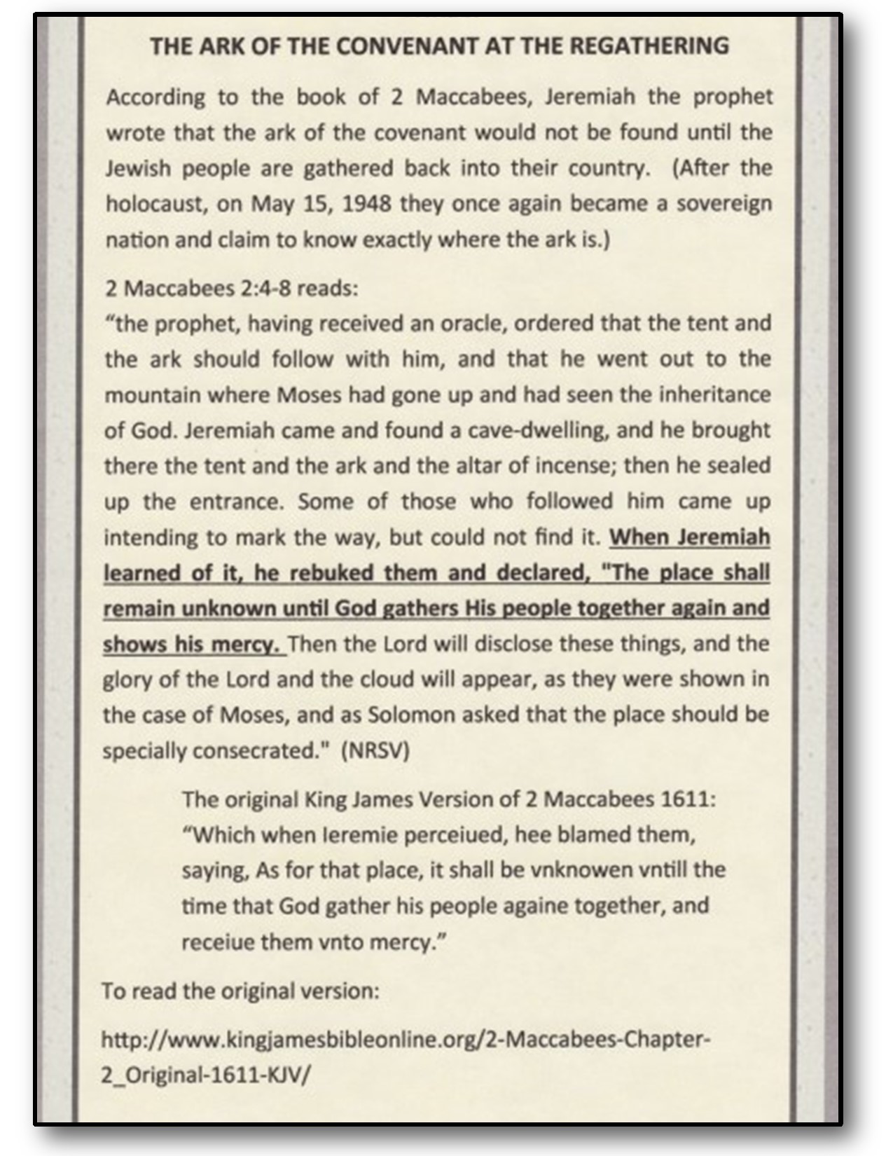 - (This) place shall remain unknown until God gathers his people together again and shows his mercy.’ 2 Maccabees 2:7