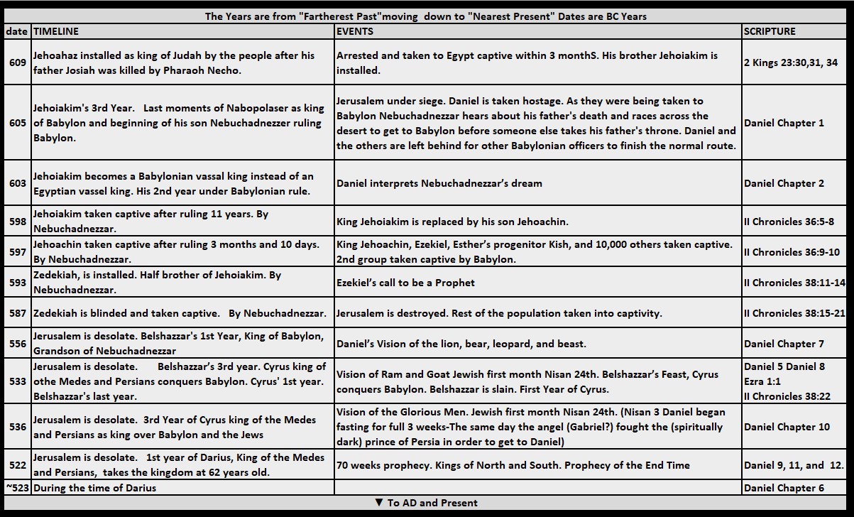 NOTE: For a timeline on these events, see: TIMELINE BC, which tracks all historical events according to the genealogies in the bible from Adam to the destruction at Masada in 70 AD; it also includes schoolbook history. Scroll to 605 BC.