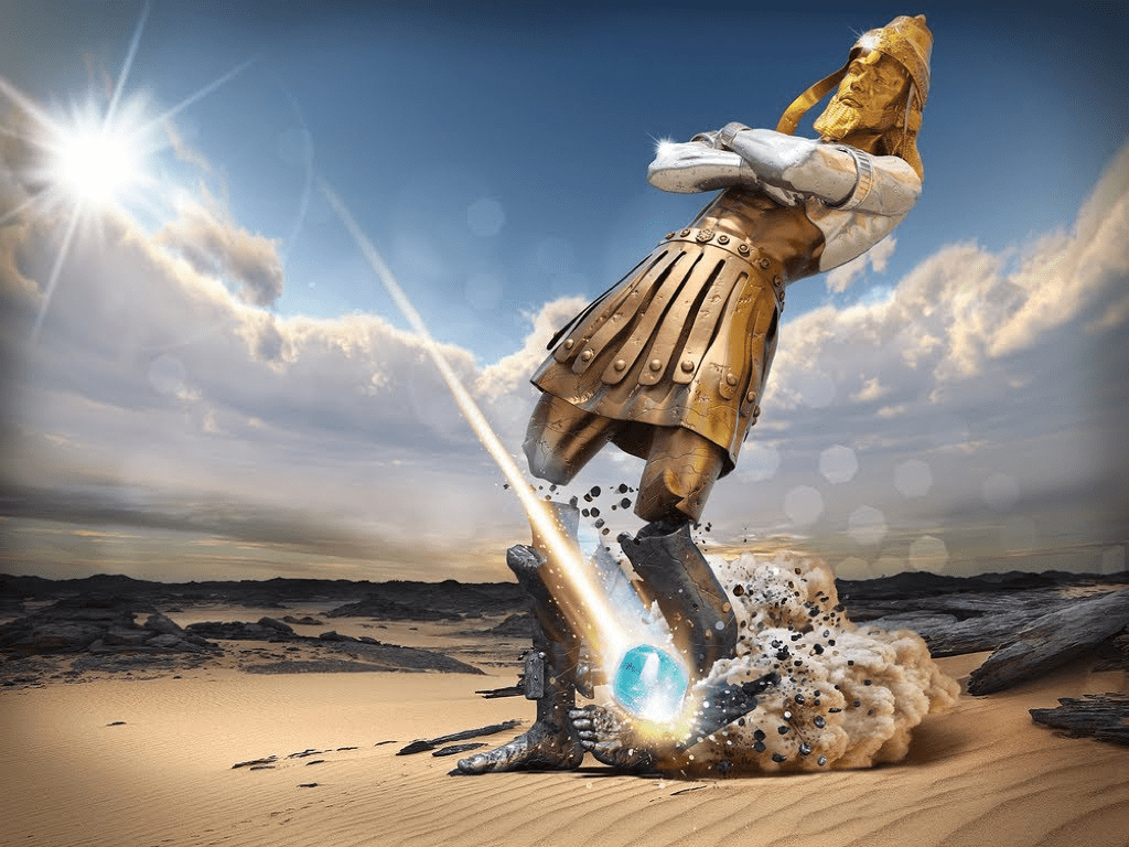 - Daniel 2:32 This image’s head was of fine gold, its chest and arms of silver, its belly and thighs of bronze, 33 its legs of iron, its feet partly of iron and partly of clay. 34 You watched while a stone was cut out without hands, which struck the image on its feet of iron and clay, and broke them in pieces. 35 Then the iron, the clay, the bronze, the silver, and the gold were crushed together, and became like chaff from the summer threshing floors; the wind carried them away so that no trace of them was found. And the stone that struck the image became a great mountain and filled the whole earth.