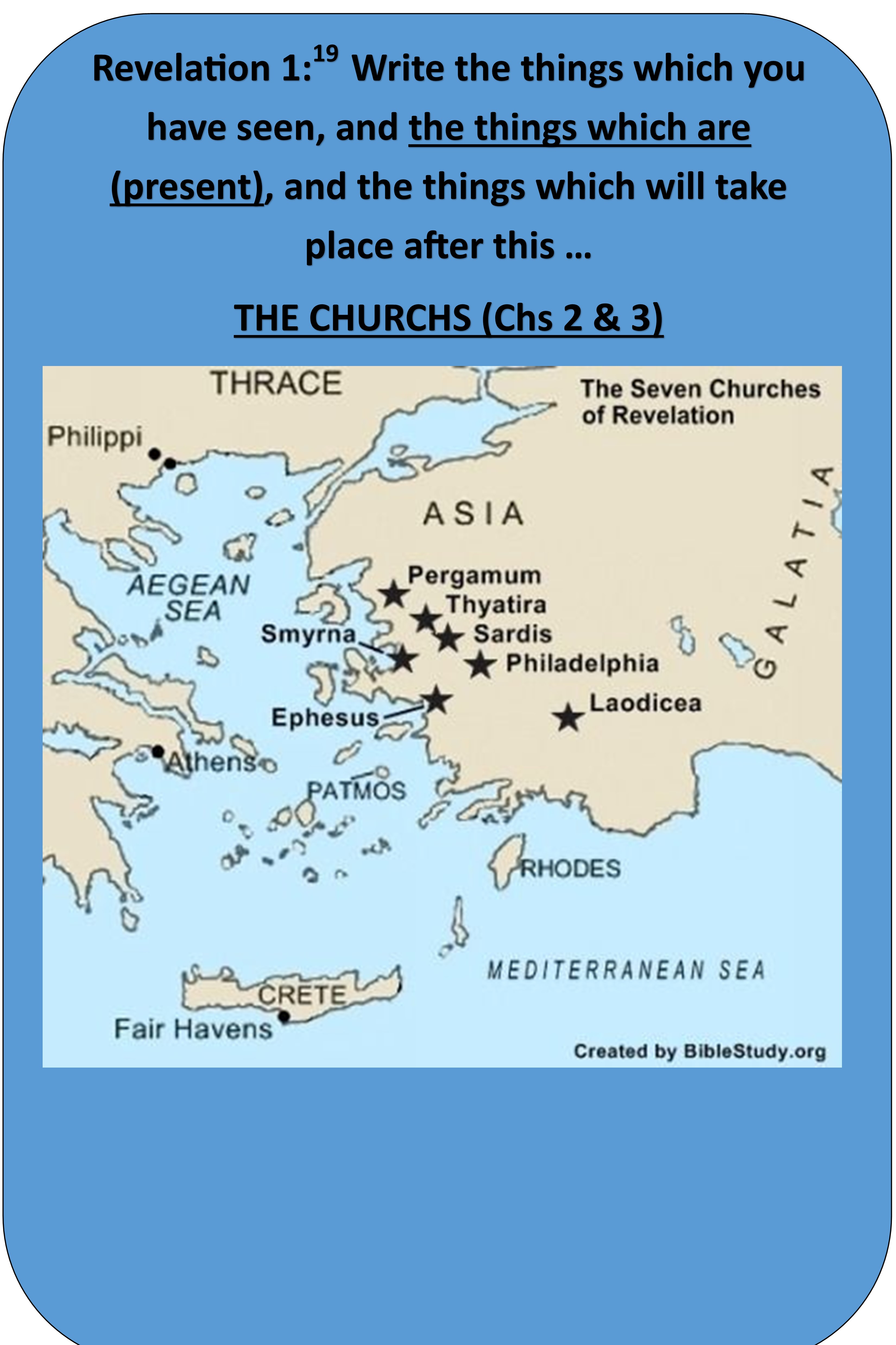 Revelation 1:19 Write the things which you have seen (past – chapter 1), and the things which are (present – chapters 2 & 3), and the things which will take place after this (future – chapters 4-22).