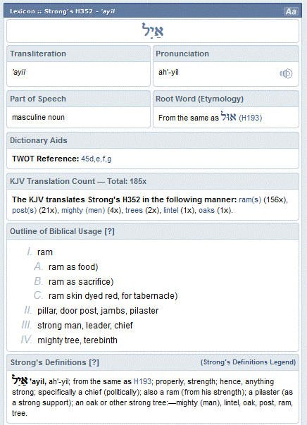 A Root Word corresponding to…‘ayil meaning ram, post, mighty (men), trees, lintel, oak all of which are descriptions of Jesus.