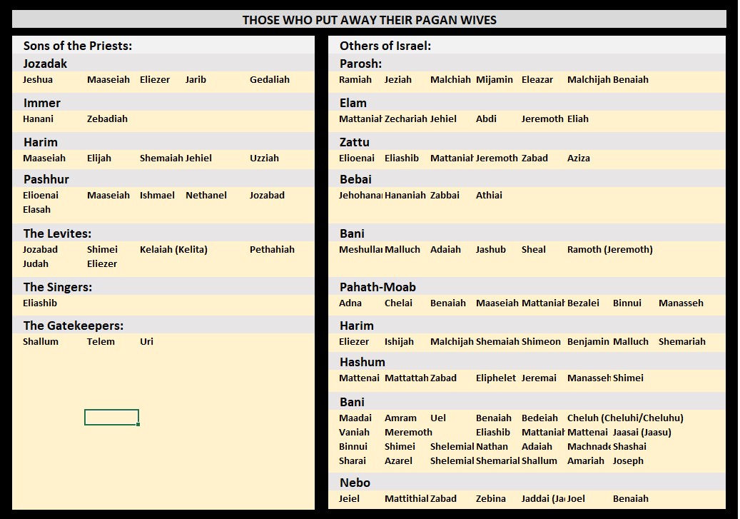 - Note: Zerubbabel is not mentioned in the list of those who took pagan wives. He is listed in Jesus’ lineage to the Davidic throne in the books of Matthew and Luke.
