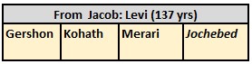 Exodus 6:16 These are the names of the sons of Levi according to their generations: Gershon, Kohath, and Merari (and a daughter Jochebed who married her brother’s, Kohath’s) son, Amran). And the years of the life of Levi were one hundred and thirty-seven.