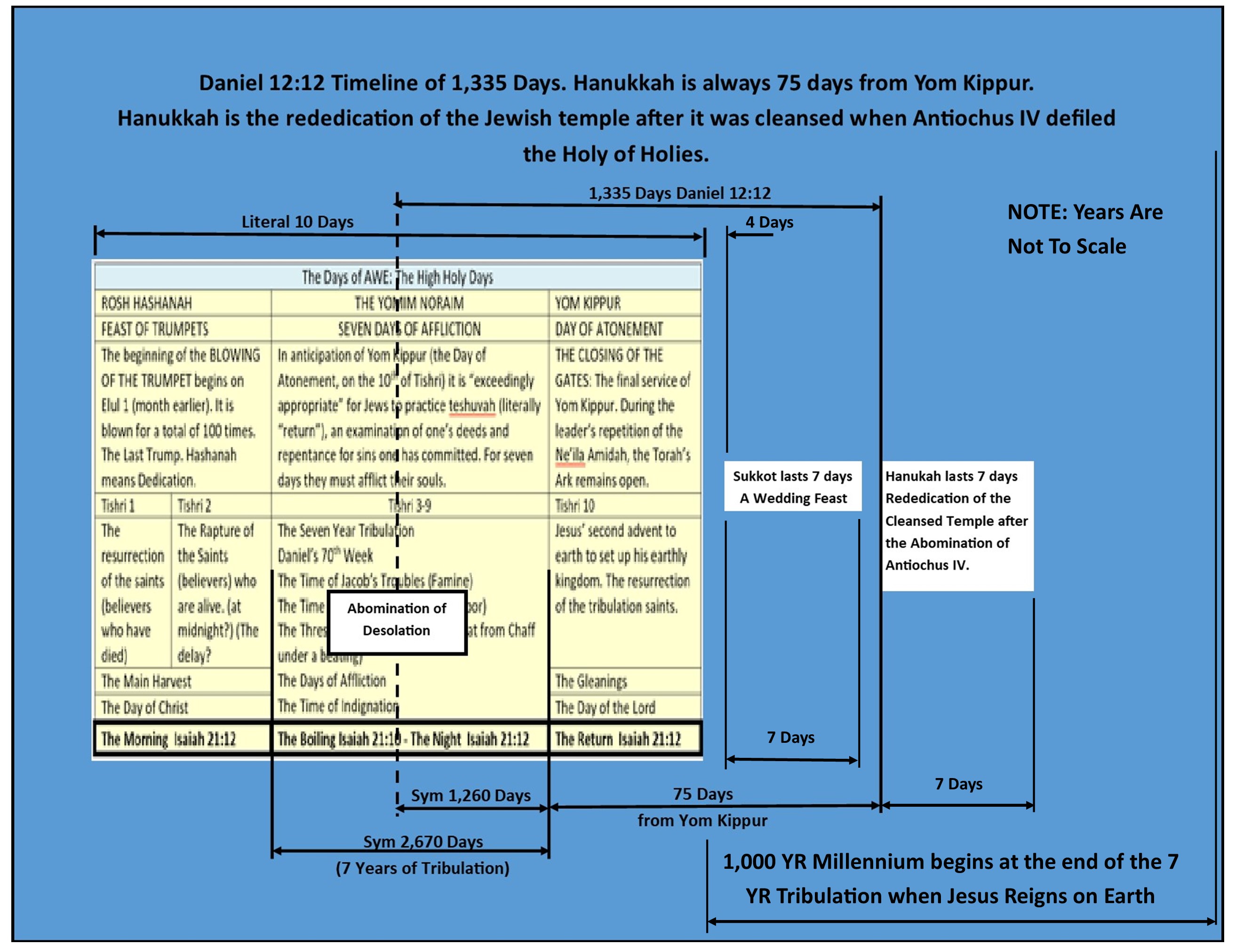 Using the Symbolic 7 days of affliction in the Jewish Feast of the High Holy Days as the 7 year tribulation shows Daniel’s 1,335 Literal Days from the “Middle” of the Tribulation when the abomination occurs to Hanukah when the Temple is cleansed during the Millennium: