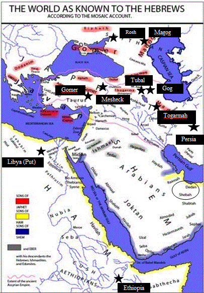 - Gog (Amalakite), Magog, Rosh, Meshech, Tubal, Persia (Iran), Ethiopia (Africa), Libya (Africa), Gomer and all its troops (The Hebrew name Gomer refers to the Cimmerians, who dwelt in what is now southern Russia, “beyond the Caucasus”); the house of Togarmah (Turkey) from the far north (of Israel) and all its troops—many people are with you. Ezekiel 38:2-6