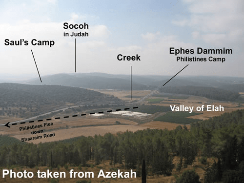 I Samuel 17:1 Now the Philistines gathered their armies together to battle, and were gathered at Sochoh, which belongs to Judah; they encamped between Sochoh and Azekah, in Ephes Dammim.