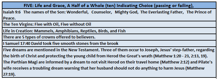 - David took five stones because Goliath had four relatives who could take blood revenge on him.