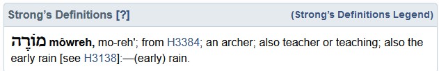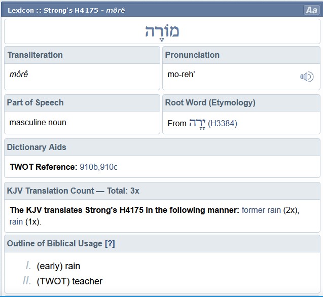 Be glad then, you children of Zion, And rejoice in the Lord your God; For He has given you the former rain faithfully, And He will cause the rain to come down for you— The former rain, And the latter rain in the first. - RAIN H4175 môrê
