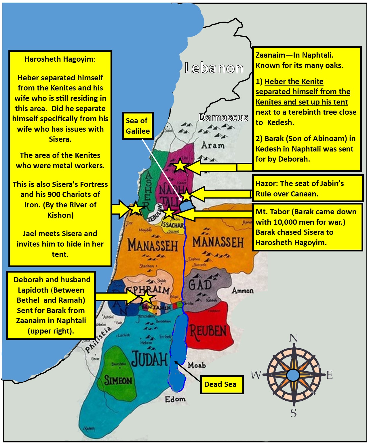 Judges 4:9 So she said, “I will surely go with you; nevertheless there will be no glory for you in the journey you are taking, for the Lord (Yᵊhōvâ) will sell Sisera into the hand of a woman.” Then Deborah arose and went with Barak to Kedesh. 10 And Barak called Zebulun and Naphtali to Kedesh; he went up with ten thousand men under his command (Lit. at his feet), and Deborah went up with him.