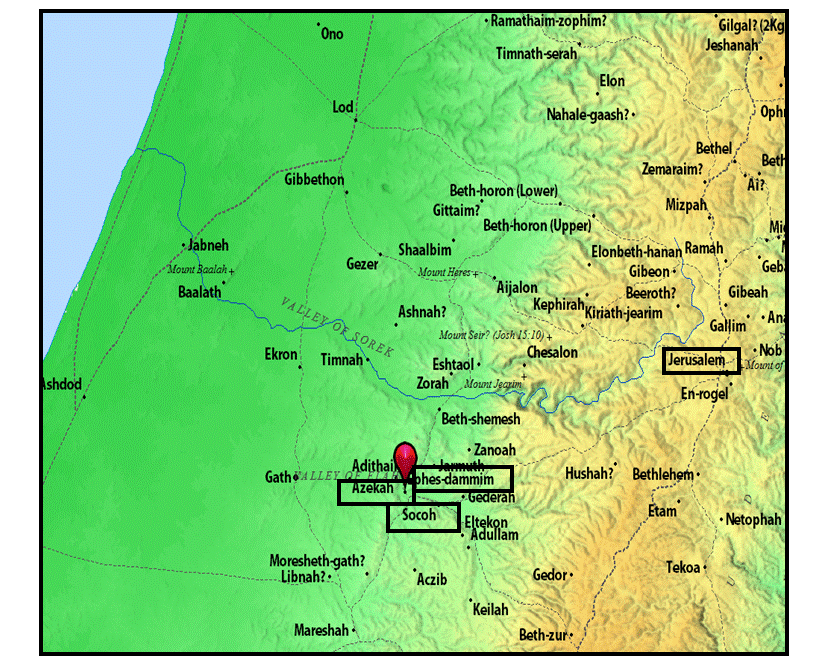 I Samuel 17:1 Now the Philistines gathered their armies together to battle, and were gathered at Sochoh, which belongs to Judah; they encamped between Sochoh and Azekah, in Ephes Dammim.
