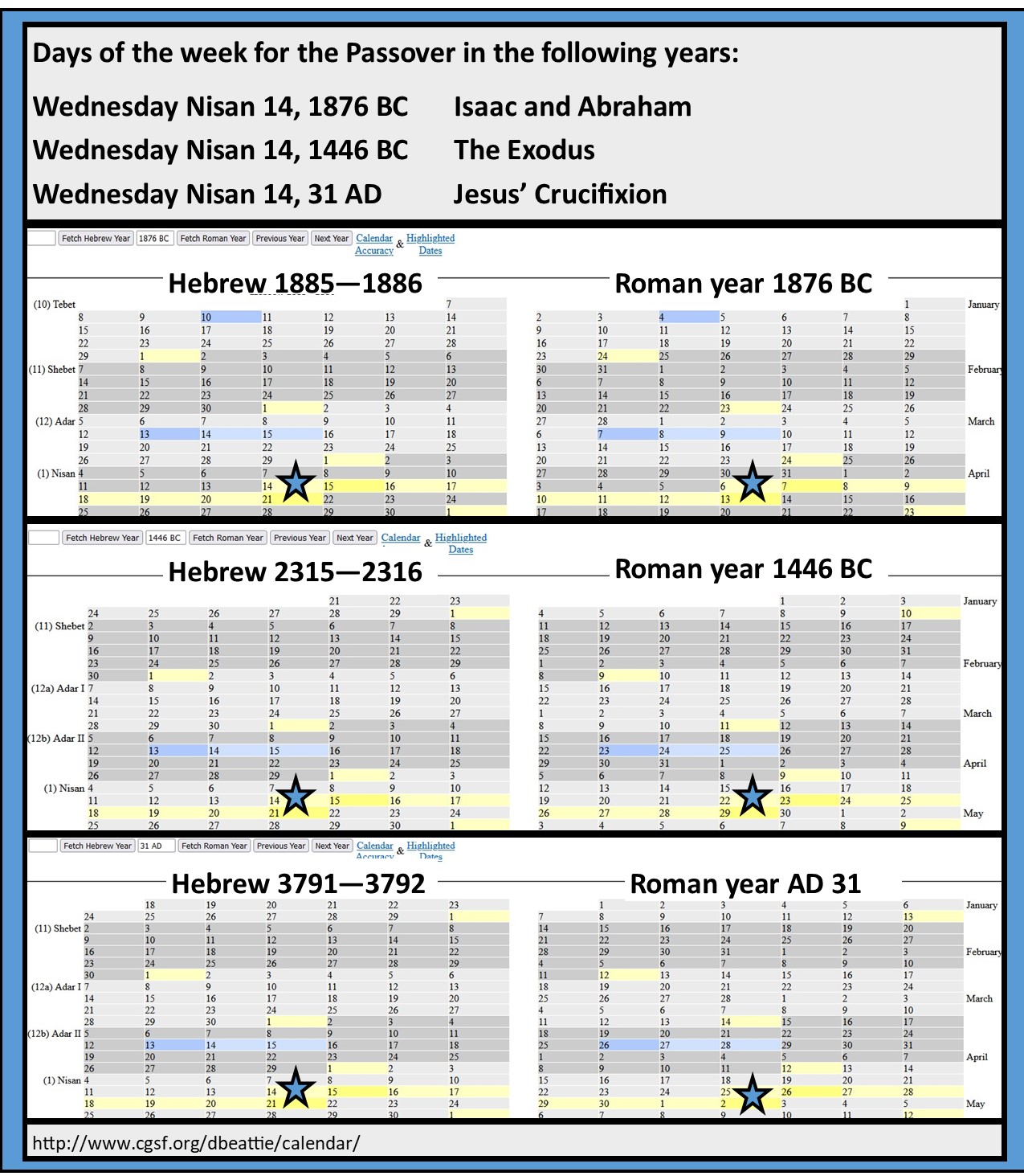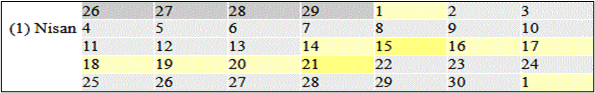 - Shown Below: The Jewish Calendar for 1876 BC (when Isaac was Offered): Month of Nissan. The first column is Sunday. The 14th is Passover falling on a Wednesday.
