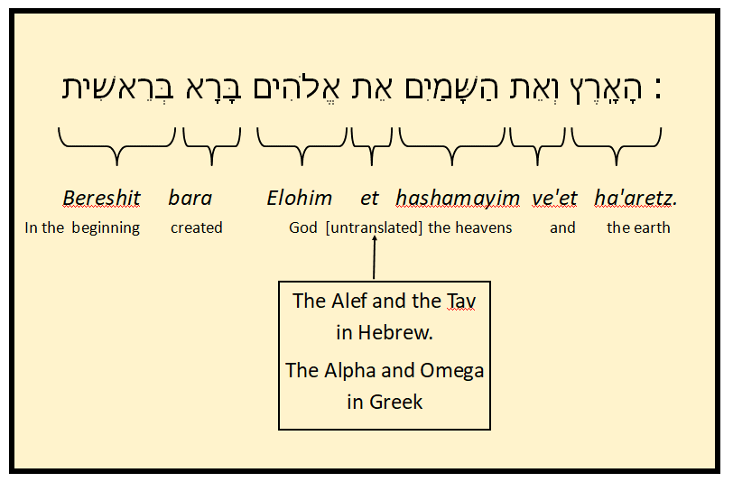 - EITHER: “et” can be read by the literal meaning of each Hebrew letter: where the “e” is the “Alef/Alpha” and the “t” is the “Tav/Omega”. The Alef and Tav are Hebrew, while their counterparts in Greek are Alpha and Omega.