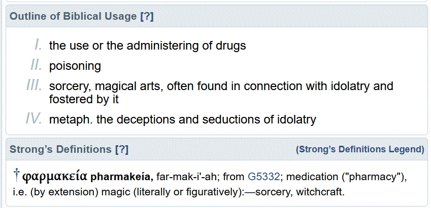 g5331 pharmakeia translated “sorceries”