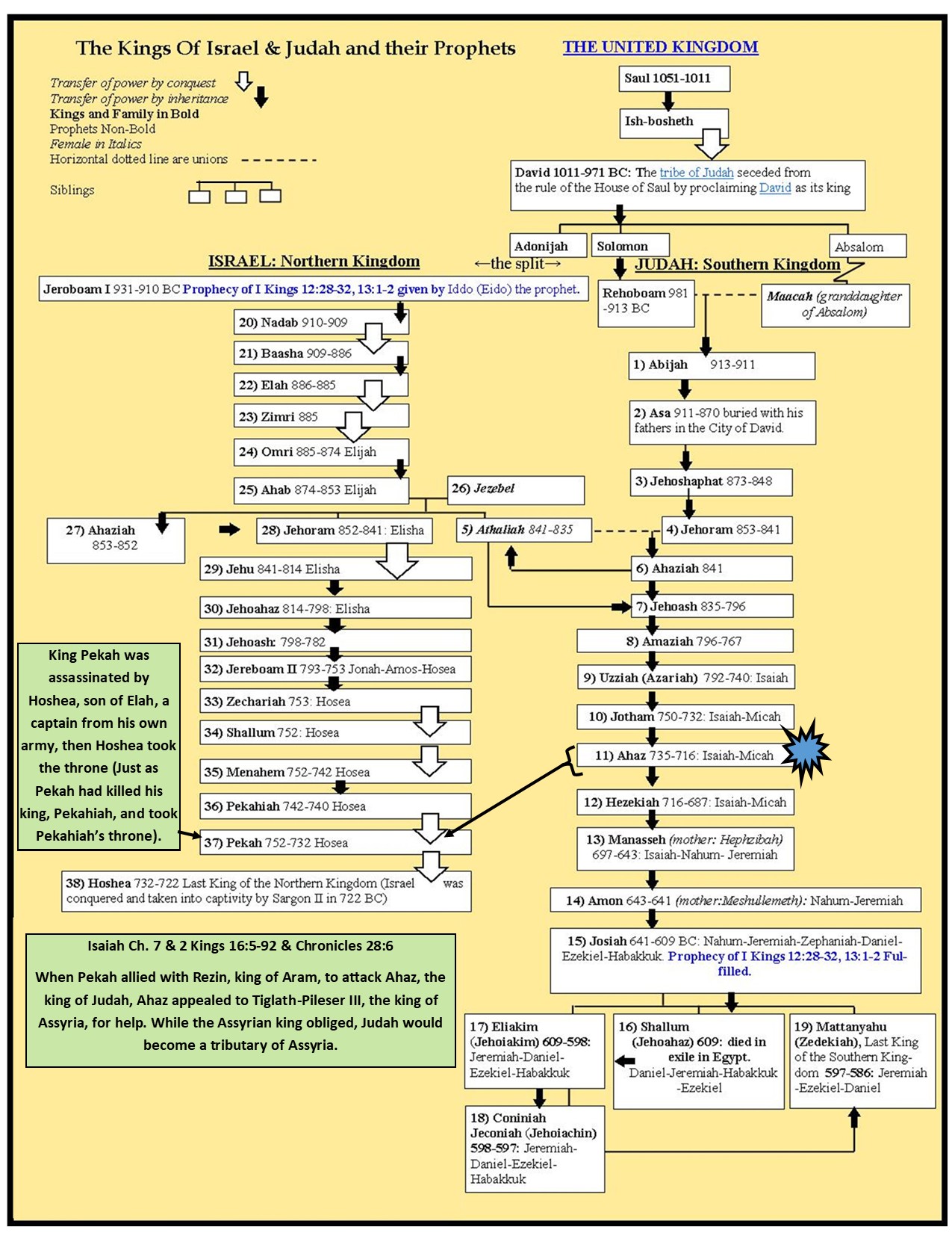 Note that on the Kings of Israel and Judah Chart at the bottom of this page, the kings of Israel were conquerors, killing and taking the throne, while the kings of Judah were all descendants of David’s lineage, traced to the coming of the prophetic Messiah, Jesus, SON OF GOD (NOT the son of Tabel).